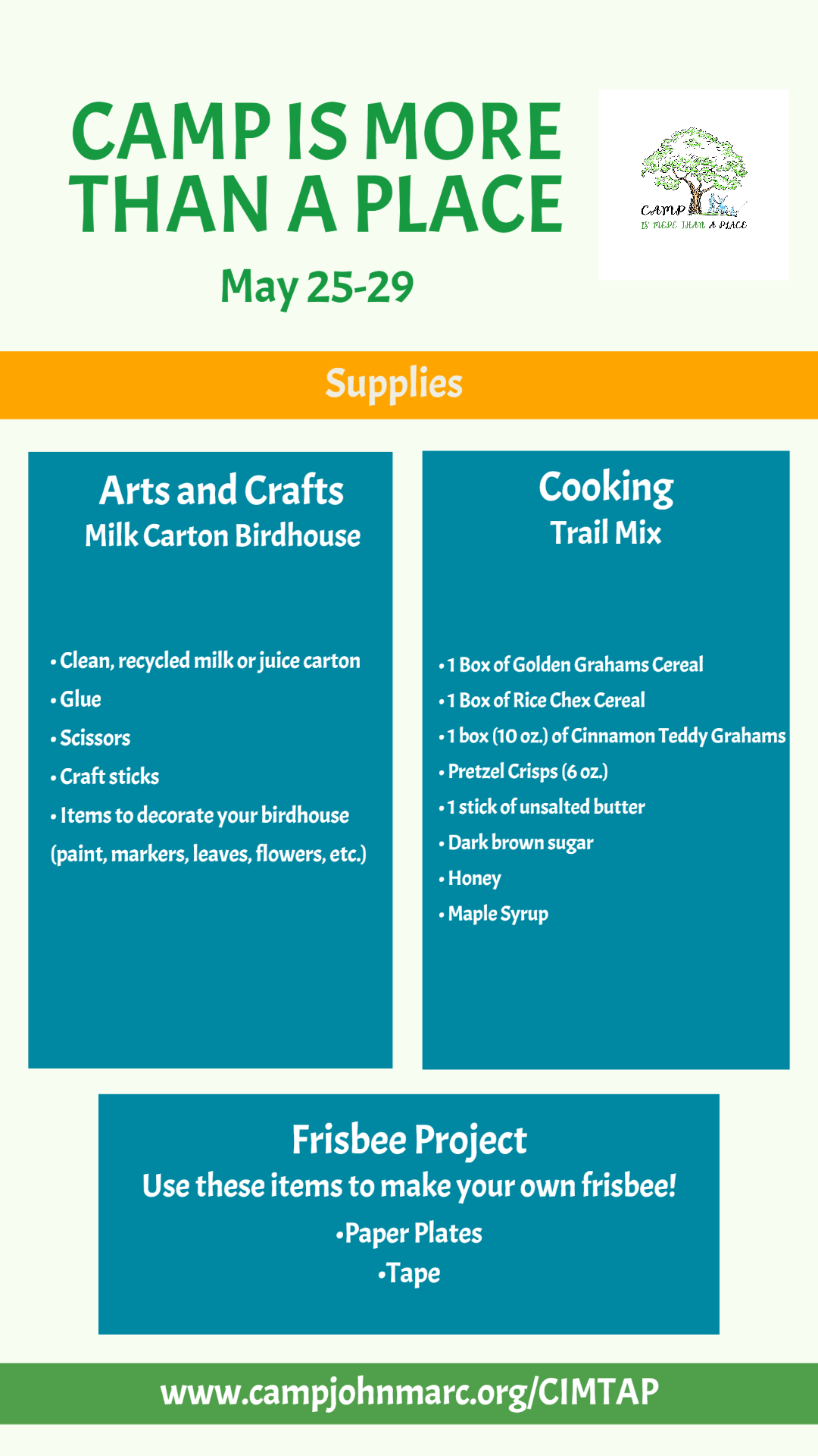 - Be sure to sign up for our weekly schedule and updates: www.campjohnmarc.org/CIMTAP